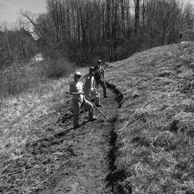 A volunteer work crew tends to a new hiking and bicycling trail through the property of Southern Vermont College. The trail is part of a network being maintained and expanded by the 2-year-old nonprofit Bennington Area Trail System. Courtesy photo/Jared Newell