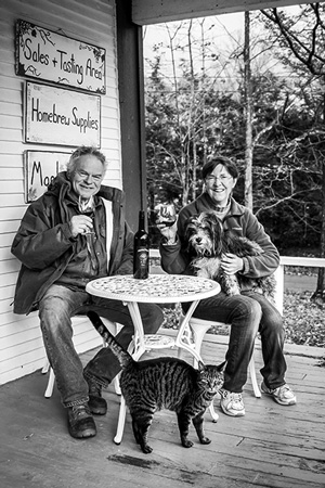 Dennis Brown Jr. and Amy Ray, the owners of Whaleback Vineyard, relax on the porch outside their tasting room with their dog, Pepper, and cat, Marc. >