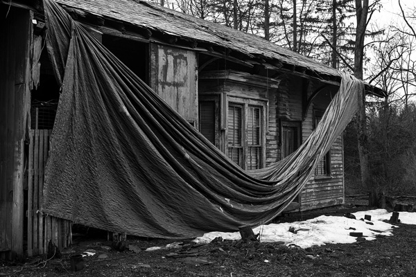 The building’s slate roof and foundation have deteriorated, and the overall structure has suffered extensive damage over time.