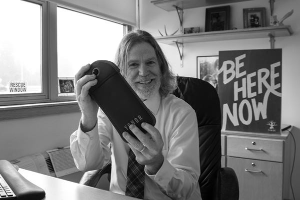 Ralph Harrington, the associate principal for grades 7-12 at Cambridge Central School, shows off one of the pouches in which students’ cell phones are sealed throughout the school day. Joan K. Lentini photo